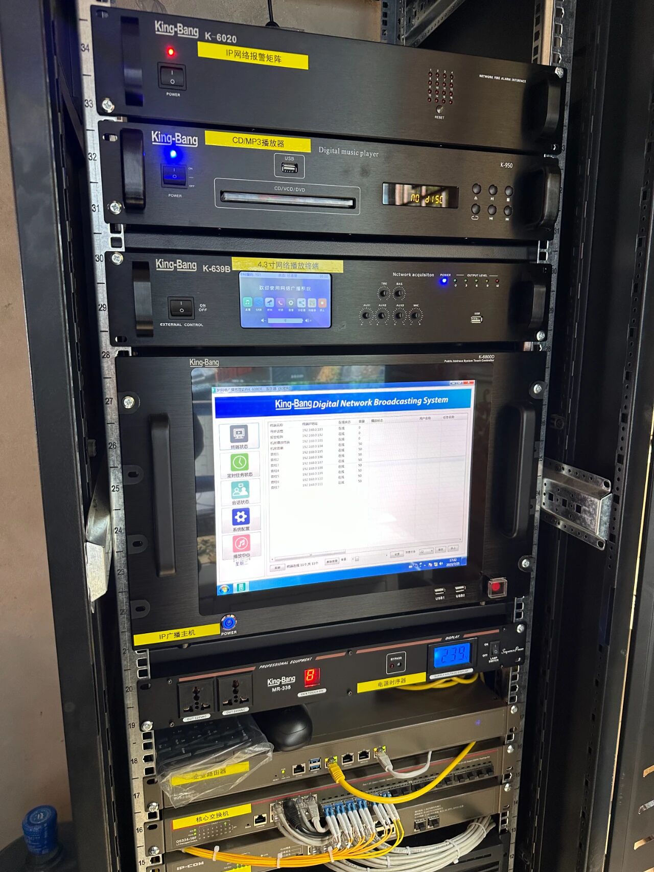根據(jù)用戶需求,配置了15英寸IP網(wǎng)絡(luò)觸屏廣播服務(wù)器(支持多種音樂播放模式,如USB熱插播、硬盤)、4.3英寸IP網(wǎng)絡(luò)機(jī)架編碼器(觸屏版)內(nèi)置自定義8個(gè)快捷按鍵,每個(gè)按鍵可定義中文名字為廣播喊話、雙向?qū)χv、及文件廣播等應(yīng)用,DVD/MP3播放器(微電腦控制,輕觸式按鍵操作),16路網(wǎng)絡(luò)報(bào)警矩陣(系統(tǒng)可支持多臺(tái)IP網(wǎng)絡(luò)消防采集器同時(shí)接入,用戶可根據(jù)自己的需求任意擴(kuò)展),8路20A多功能時(shí)序器(芯片控制,使電路更加穩(wěn)定可靠),大功率室外防水音柱揚(yáng)聲器等廣播設(shè)備(適用于大型廣場、操場、公園、體育館、高速公路、高鐵、地鐵等場所進(jìn)行遠(yuǎn)程擴(kuò)音,可用來應(yīng)急廣播和播放背景音樂)。讓整套系統(tǒng)使用效果更佳,使用更加方便。