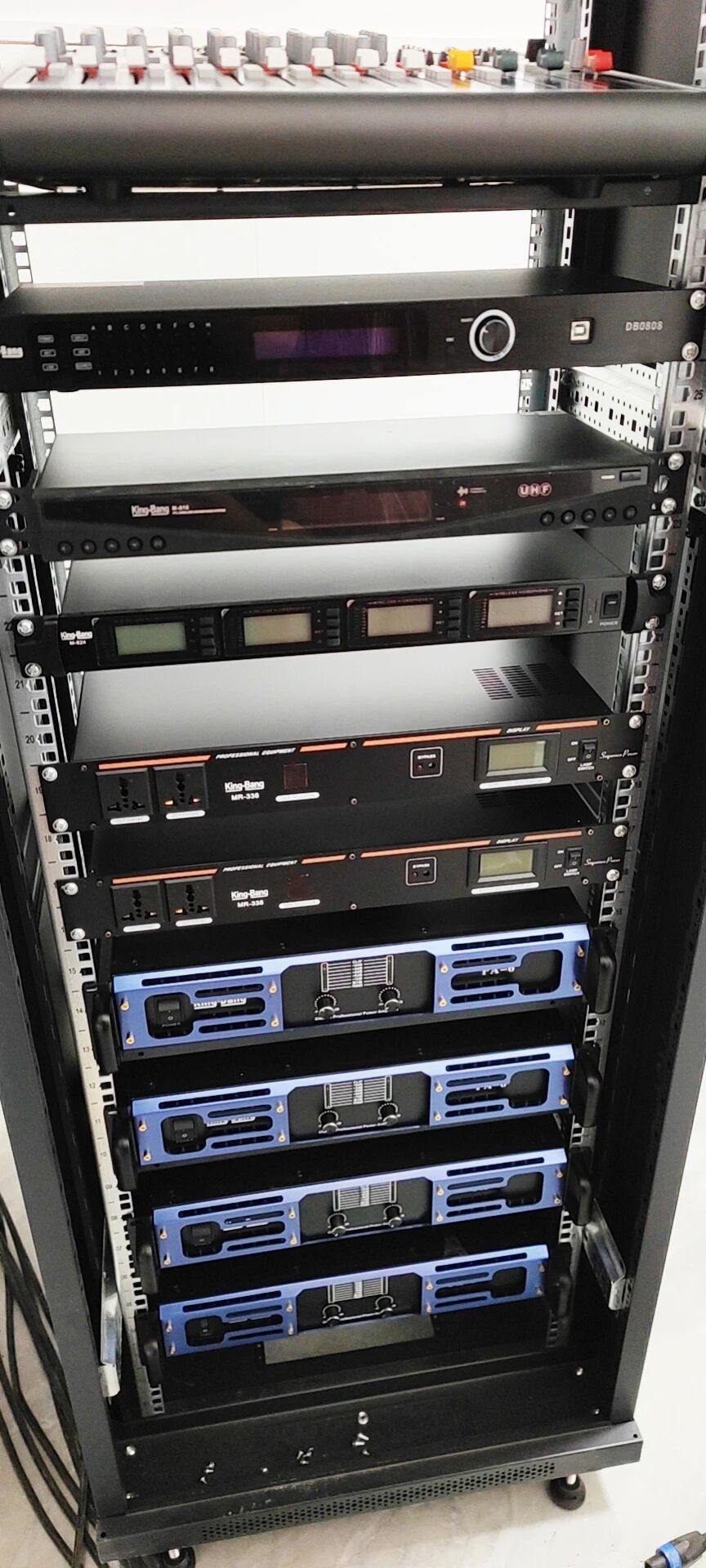 前級的放大和混音輸出、音頻信號處理的設備,如:調音臺、均衡器、反饋抑制器等設備;放大設備——指對經過調控設備混音輸出、信號處理后的信號進行后級功率放大設備,這里指專業(yè)功率放大器;重放設備——指將經過后級功率放大器放大的音頻信號進行電—聲轉換并釋放表現出來人耳可懂的聲頻信號的設備,這里指揚聲器;
