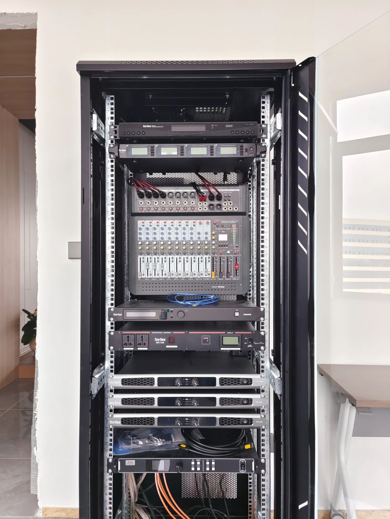 專業擴聲系統簡單來說就是把聲音信號放大,主要由聲源、音頻處理設備、功放及揚聲器系統組成。通過計算會議室的音響場地系數進行設計,保證會議室每個角落的聲場聽覺均勻,音響效果達到語言清晰、無失真、聲場分布均勻。