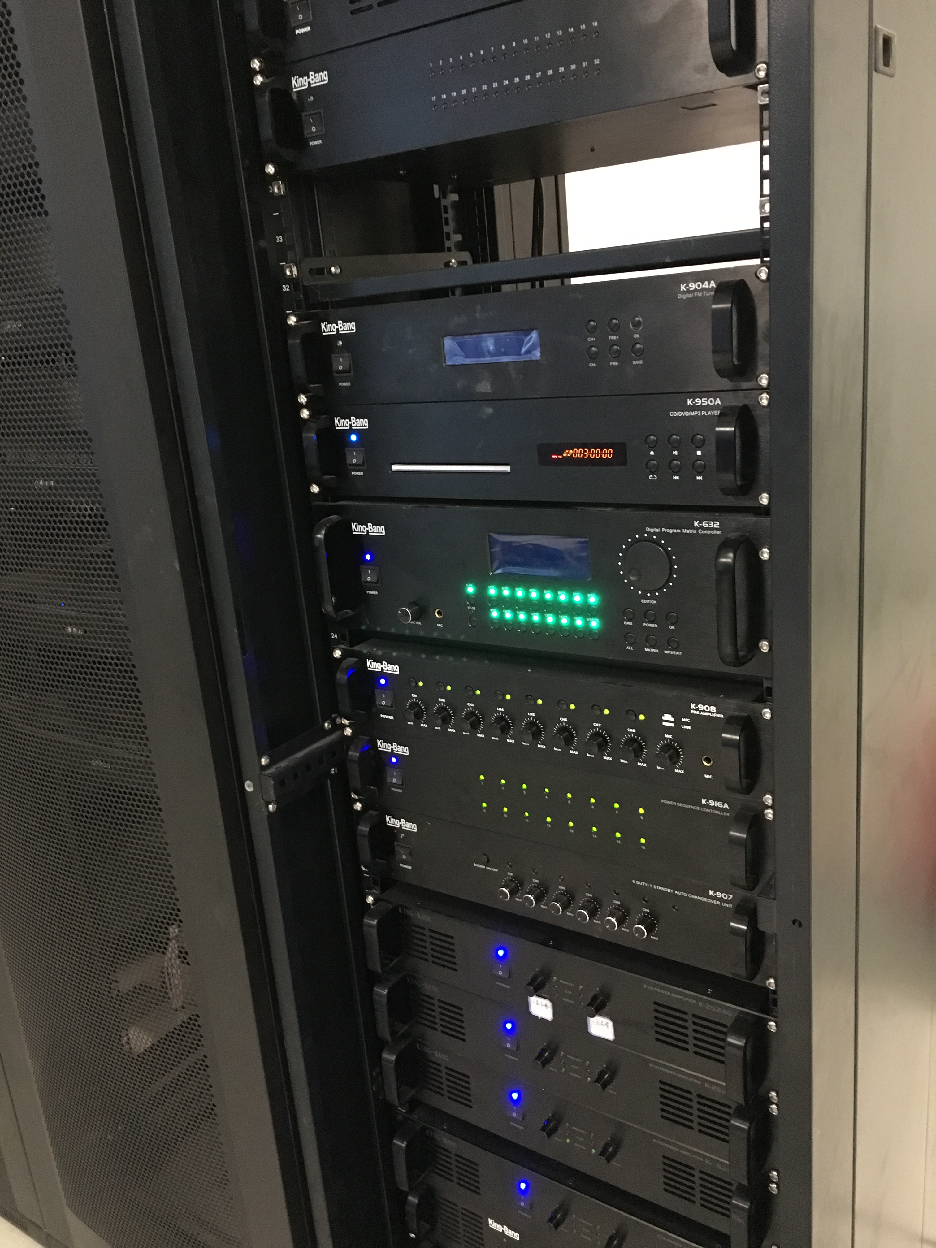 該項目共配置了1套智能廣播系統(tǒng),由控制中心同時控制博物館所有區(qū)域的背景音樂、定時打鈴、尋呼廣播等功能。京邦電子(KING-BANG)廣播系統(tǒng)是集播放、智能定時控制、遠(yuǎn)程尋呼、智能消防聯(lián)動等功能于一身的公共廣播系統(tǒng)。