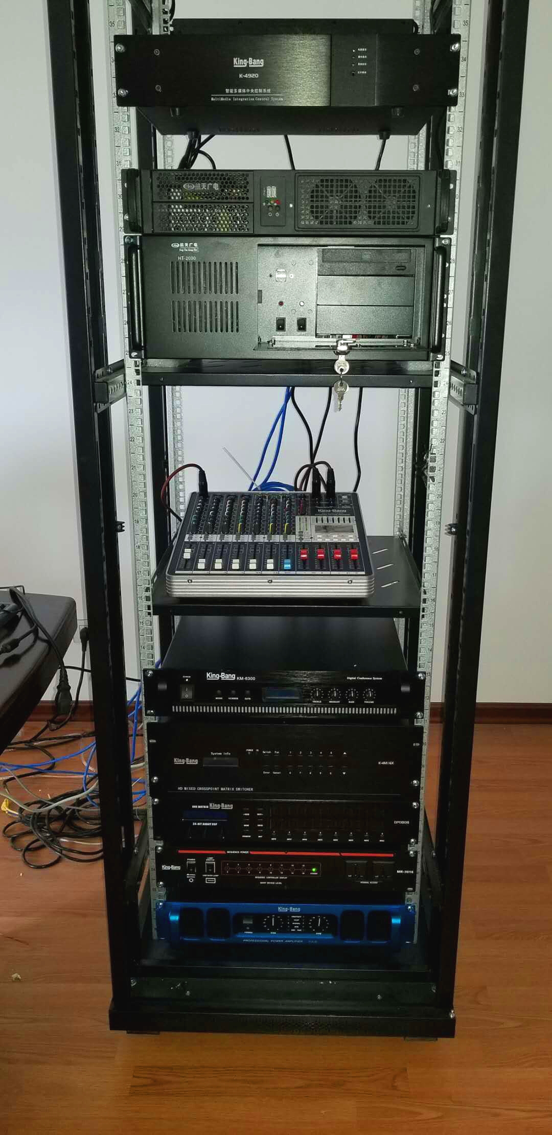 中央控制系統:選用京邦電子(KING-BANG)可編程網絡中控主機K-4920作為整個會議室的控制核心,對會議室內各個子系統進行控制。內嵌式高效處理器,集成化處理芯片,能高速運行復雜的邏輯命令。保障了整個執行指揮中心所有設備的都能流暢、穩定的運行。可對整個系統編程控制,用戶可根據自己的使用習慣對控制界面進行的設計,控制方式更友好、更具人性化。
